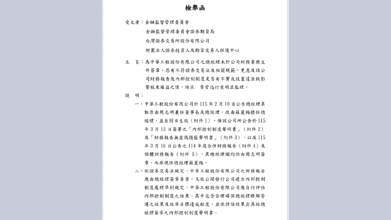 中華工程(2515)再爆公司治理爭議。小股東黃文泰正式向金管會、證期局、證交所和投保中心檢舉,質疑公司前總經理周志明升任董事長、由蘇麗梅接任總經理,並完成公告異動後,關鍵財務與內控文件仍由「總經理周志明」簽章,背後原因引發高度關注。黃文泰質疑:「是不敢簽?還是不能簽?」