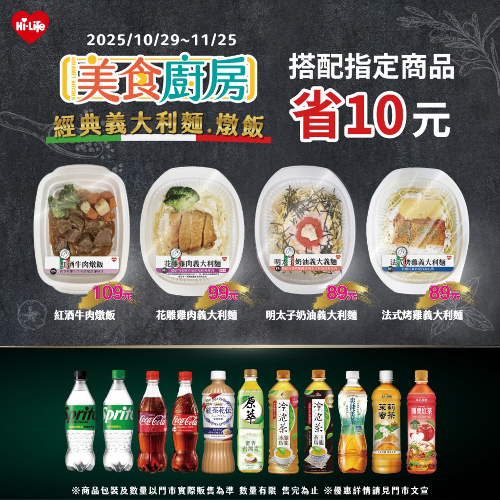 面對單人用餐的普遍情境,萊爾富也推出僅於生鮮門市販售的一鍋搞定蔬菜盤,售價89元,將多種蔬菜一次集結,讓加班族或獨居族也能輕鬆補充營養。同時,義饗廚房系列在冬季進一步升溫,並祭出搭配指定飲品現省10元的優惠。套餐選擇涵蓋紅酒牛肉燉飯、松露野菇燉飯、花雕雞肉義大利麵與明太子奶油義大利麵等,從濃郁酒香、奶香到微辣風味一次滿足,多樣化餐點成為寒冬中最受期待的外食選項。