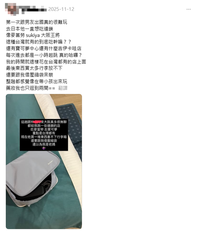 商傳媒|記者張瑞珊/綜合報導 近日一名網友在Threads分享與男友赴日旅遊時的趣事,引發網友熱烈討論。她提到,因男友「超強購物慾」導致行李暴增,還得臨時跟她借壓縮袋打包。 (圖/取自Threads) 貼文曝光後,不少網友紛紛留言表示太有同感,更有人分享自己旅伴在日本時一樣買到需要再買一顆行李箱,引發一波旅遊共鳴潮。也有網友表示:「建議男友分手 根本是成為寶可夢大師路上的絆腳石」、「藥妝店台灣也有啊== 你們幹嘛不分開逛 晚上再見面」,也有網友討論起日本連鎖餐廳的份量與台灣相比差異甚大,「其他的我不評論 但麥當勞跟寶可夢中心是一定要去的,日本麥當勞很多品項是台灣沒有的 寶可夢中心則是會有地區限定,而且每間的主題都不一樣」。 (圖/取自Threads) 更有趣的是,貼文中提到的壓縮袋品牌官方帳號也親自現身留言,向原PO表示:「歡迎私訊小編~我們想送你們幾個壓縮袋,期望能讓你們的下一趟旅程更輕鬆!」親民回覆讓許多網友直呼「小編好暖」。 針對旅遊行李超載的常見問題,旅遊業者表示,許多旅客赴日、韓等地旅遊時,因採買習慣不同常有「出發一個包、回程兩個箱」的狀況,建議提前準備壓縮袋、行李秤、額外可折疊包袋等工具,避免臨時加買行李或托運超重的額外支出。