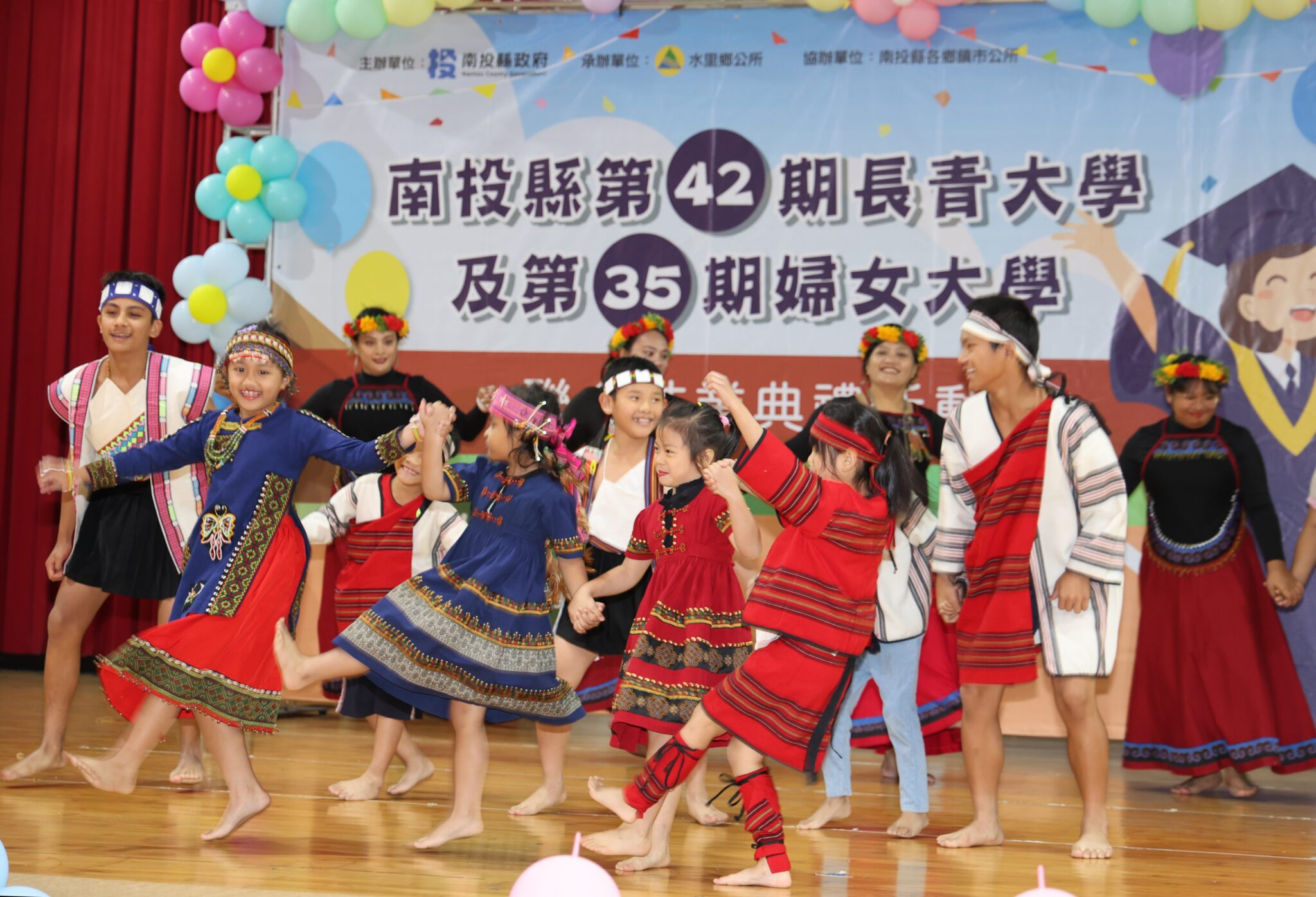 展現多元課程成果、3千學員受惠的長青及婦女大學結業典禮,於11日上午在國立水里高級商工職業學校隆重登場,以熱情的「原住民迎賓舞及歌謠傳唱」揭開序幕,縣長許淑華親臨主持,包括縣議員陳淑惠、水里鄉長葉銘豐、國姓鄉長邱美玲及水里商工校長許文雄等來賓也出席。