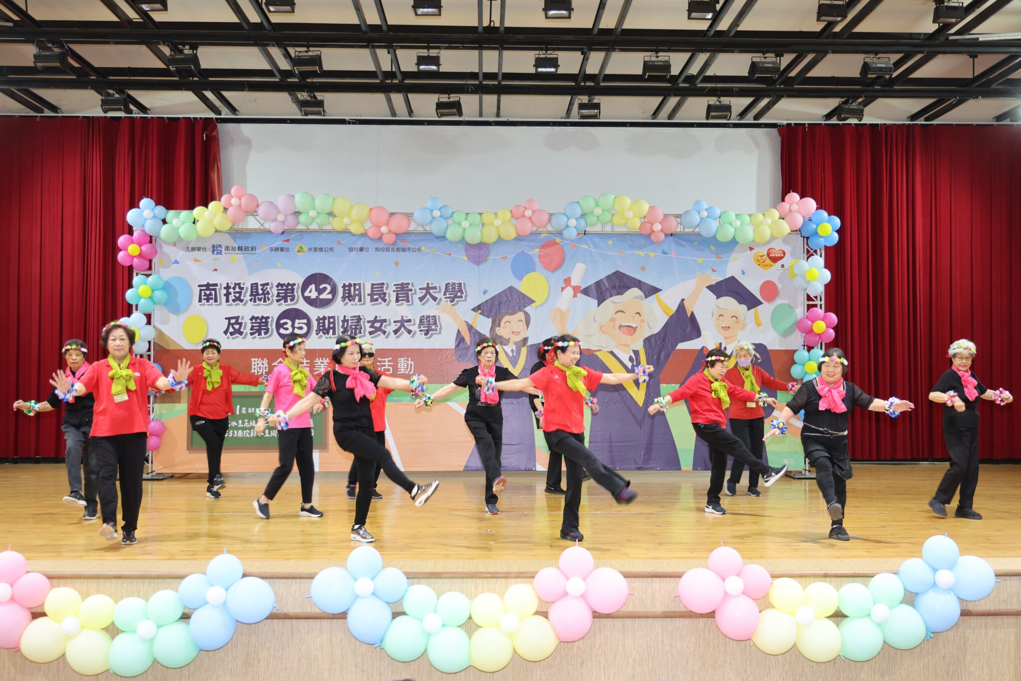 學員齊聚交流期待明年再相會,典禮中,由水里鄉、仁愛鄉、信義鄉、國姓鄉及魚池鄉等地的長青與婦女大學學員輪番上陣,帶來精彩的成果表演,展現出不輸年輕人的活力與自信。