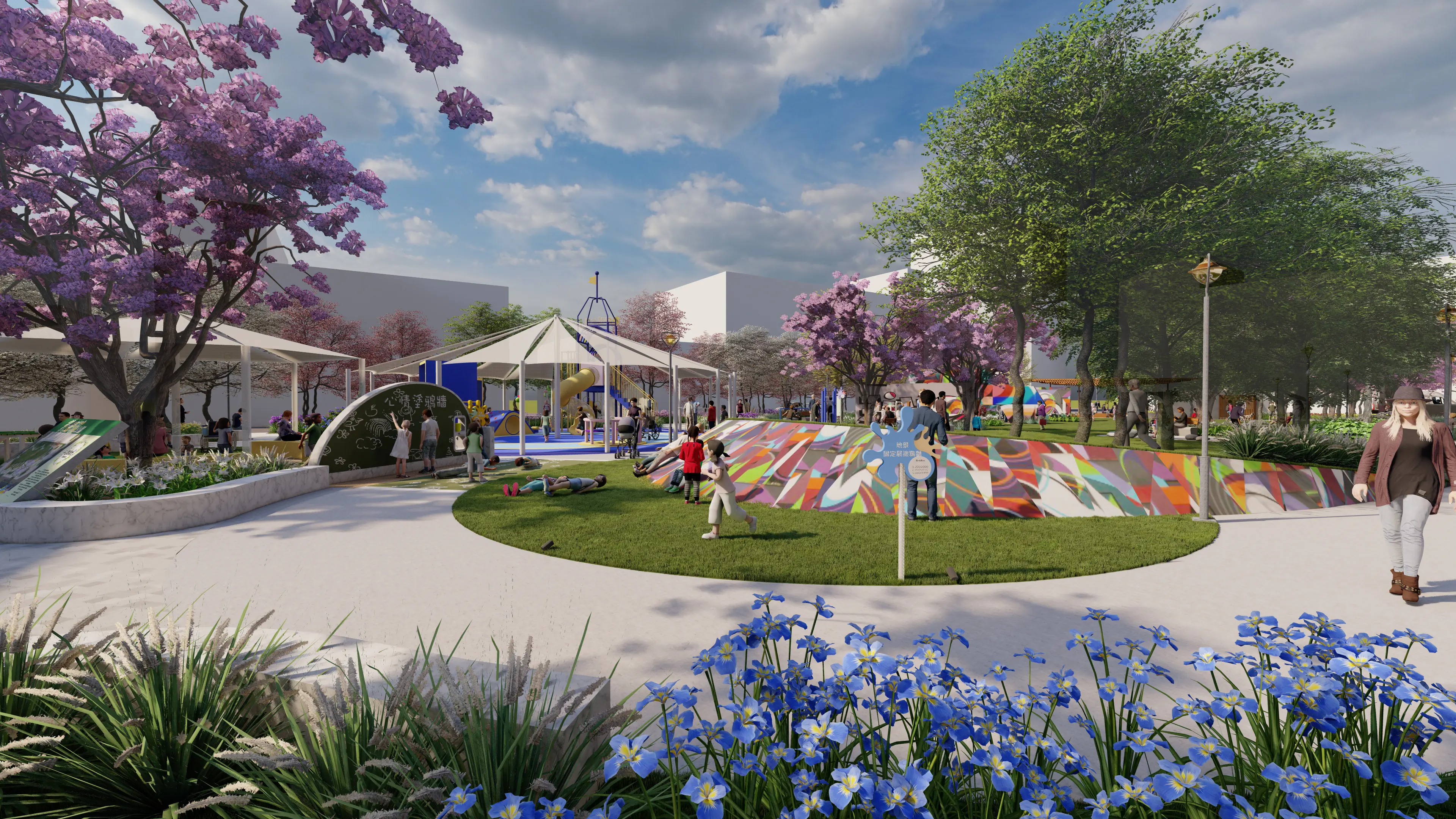 陳局長指出,公園面積為3,384平方公尺,整體設計以「街區再生、活力藝術」為核心理念,在保留歷史紋理基礎上導入當代表現語彙。公園內設置溜滑梯、遊戲沙坑及「市場家家酒」主題設施,讓孩童在遊戲中延續市場生活意象;體健區則配置銀髮友善運動器材,完善鄰里健康空間;另設塗鴉主題牆作為視覺焦點,提供創作與交流場域,拉近藝術與市民距離。