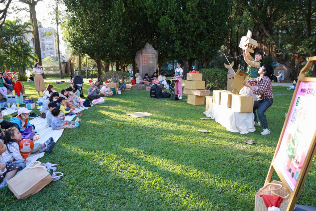 《誰來發禮物》草地親子劇在國父紀念館中山文化園區開演,現場除戲劇表演外,也結合家庭支持、陪伴與關懷概念,希望透過文化力量傳遞更多社會暖意。