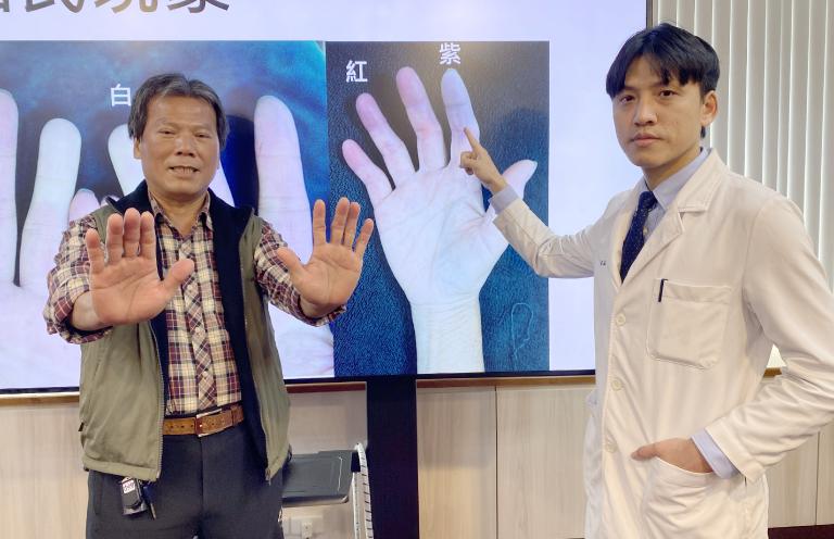 台中64歲邱先生發現手指尖在寒冷天氣下變成紫色,輕觸就疼痛,之後延伸至手臂,連騎機車都疼痛難忍,原以為是末梢神經循環不佳,就醫2個月看神經科、疼痛科吃藥無改善,病況持續惡化至膝蓋僵硬、無法彎曲,工作被迫中斷。護理師女兒四處尋醫,最終為父親掛號過敏免疫風濕科,確診全身性硬化症(又稱硬皮症),由臺中榮總顏在弘醫師安排以免疫調節藥物治療後,皮膚緊繃、關節疼痛與皮膚脫色情況明顯改善,重拾生活、重返職場。