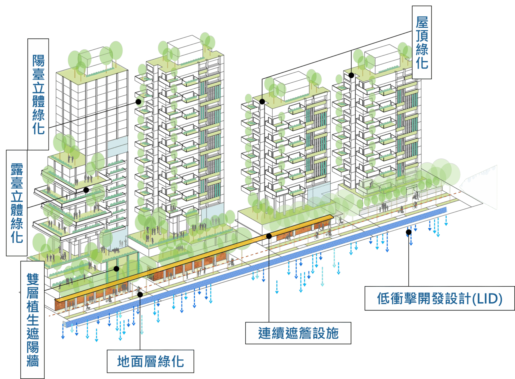 在節能與永續推動方面,114年5月公告建築物能源耗用管制辦法,依法應取得綠建築標章之公私有新建建築物,建築能效應達1+級。配合市府「降溫城市」政策,建管處立即調整綠化相關規範,期以減緩都市熱島效應。114年7月新修訂之綠化實施規則,首創導入「綠容率」、「等效綠覆面積」及立體綠化等規定,強化植栽遮蔭與建築節能,預計每年可增加約5萬平方公尺立體綠化設施及近1.5萬棵喬木,有助達成體感降溫2℃的目標。