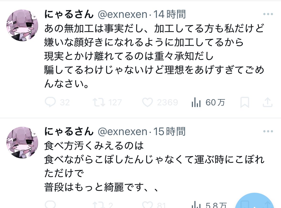 日本にゃるさん,在X(推特)分享自己的地雷系妝容自拍照,結果有網友曝光她素顏照後。にゃるさん表示沒修圖是事實,修圖的人也是自己,因為是修成喜歡的樣子,所以知道這跟現實差很多,不是想騙人,但對不起,把理想提得太高了。