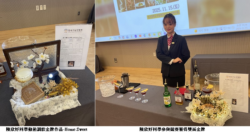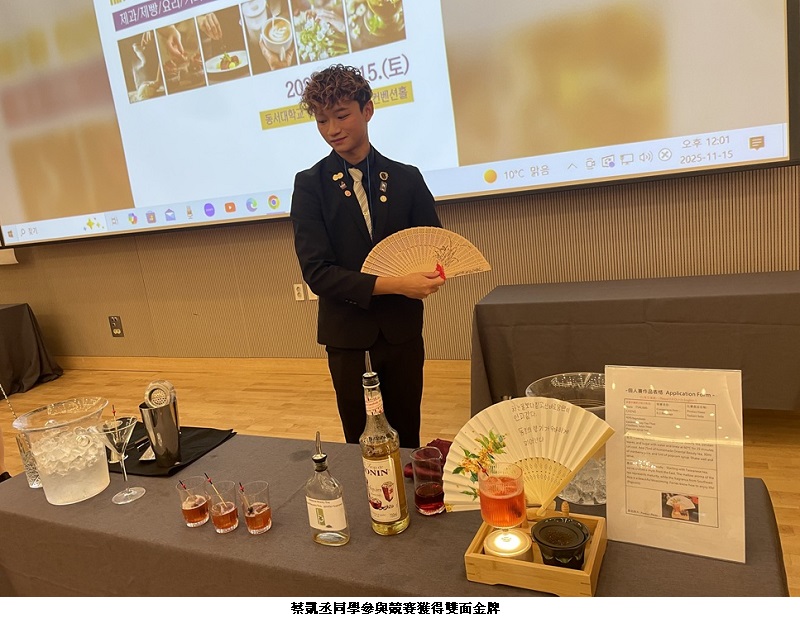 面對眾多國際選手,休觀系學生表現相當不俗。其中蔡凱丞、陳欣妤與李畇蓁三位同學於動態傳統調酒組分別以《Ghost》、《Flare》與《Breeze of Early Summer》奪下金牌,三人皆以韓國在地特色燒酒為基底,融合個人風格與跨文化美學,使作品深獲評審青睞。