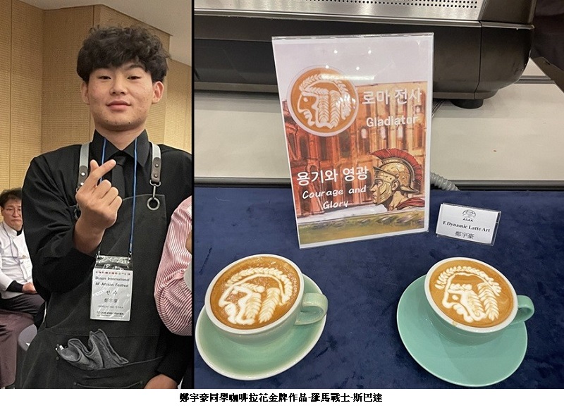 在其他組別中,林芸稹同學於動態傳統調酒組與動態飲料調製組雙獲銀牌,展現穩定且成熟的技術力;謝宜樺同學在動態傳統調酒組奪得銀牌,並於動態飲料調製組拿下銅牌,實力同樣備受肯定。咖啡拉花組方面,鄭宇豪同學以流暢手勢與穩定奶泡呈現「羅馬戰士—斯巴達」圖案勇奪金牌,而廖佑慶同學以精準手法完成風格平衡的鬱金香拉花,摘下銀牌。