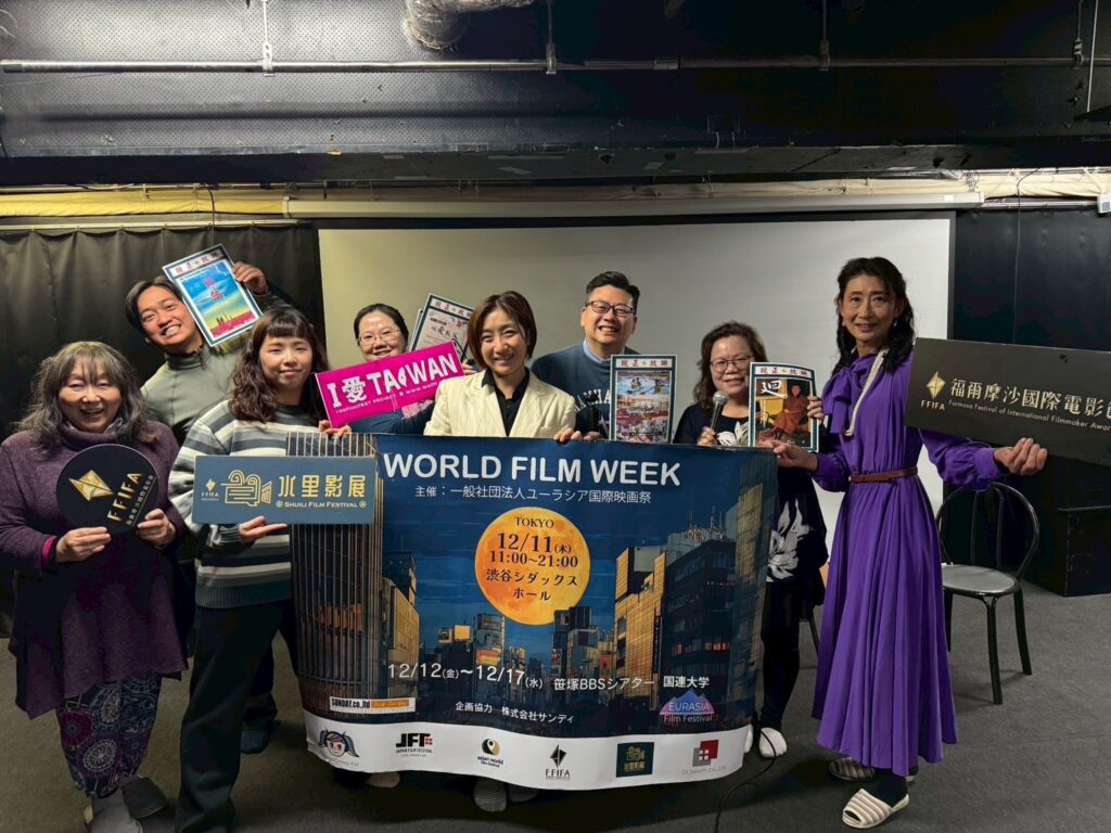 在頒獎典禮上,洪馬克導演的作品《以愛致父》意外榮獲「傳統文化傳播獎」(Traditional Culture Promotion Award)。洪導特別致贈象徵台灣常民信仰的「白沙屯媽祖紅色門簾」給歐亞電影節,呼應其發揚多元文化的精神。這面大紅門簾在閉幕式上極為搶眼,成為全場最溫暖的文化圖騰。 此行建立起龐大的跨國交流網,日本《美作物語》導演松井和彦深受台灣作品感動,甚至在頒獎台上高舉「I Love Taiwan」紅旗,將現場氣氛推向最高潮。松井導演表示,《守》與《雲上守護者》關注的生態議題,讓目前移居鄉下的他充滿共鳴,期待與洪馬克導演聯手,在靜岡縣美作市創辦「美作電影節」,共同擔任台日電影交流的正式窗口,增山麗奈導演也表示明年歐亞電影節將從東京跨足大阪,希望串連台灣、東京、大阪三地進行影像的推廣,這種從影像共鳴轉化為實質產業結盟的成果,象徵著台灣影視外交的重大突破。 除了影展放映,洪導與《根生》導演陳樂頤受邀前往皇居旁的 TokyoFM 電台進行專訪。在遠眺皇居半藏門的錄音室中,眾人深入探討了從導演轉型策展人的心路歷程,並分享水里影展如何在一個夏天培育出多位優秀素人導演的奇蹟。該節目將於 1/4 全日廣播,訊號範圍廣及全日本,甚至在氣候良好時連台灣宜蘭都能收聽到這份來自東京的台灣榮耀。