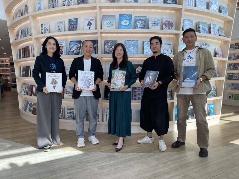 ▲益品書屋總經理戴東杰(左二)與看見・齊柏林基金會執行長萬冠麗(中)、基金會董事齊廷洹(右二),2026年全年於益品書屋攜手合作「用閱讀守護土地」環保議題。(圖╱益品書屋提供)