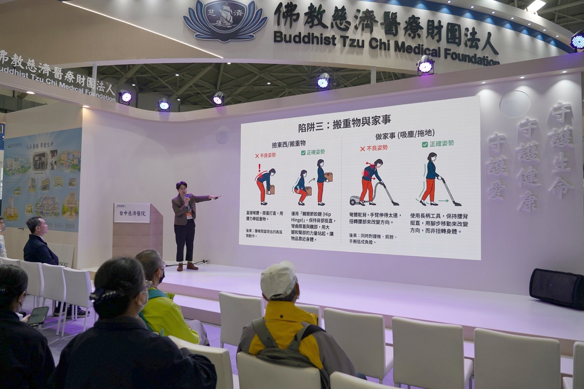 今年的台灣醫療科技展中,台中慈濟醫院在慈濟醫療志業的展位特別設置「AI智慧姿勢評估系統」體驗區。許多人在聽完兩位醫師的精彩分享後,紛紛前往攤位實地測試。透過螢幕上即時呈現的骨骼結構分析與數據報告,民眾驚呼原來自己平常不自覺的「歪腰駝背」都無所遁形,也更深刻體會到科技輔助對於健康管理的重要性。