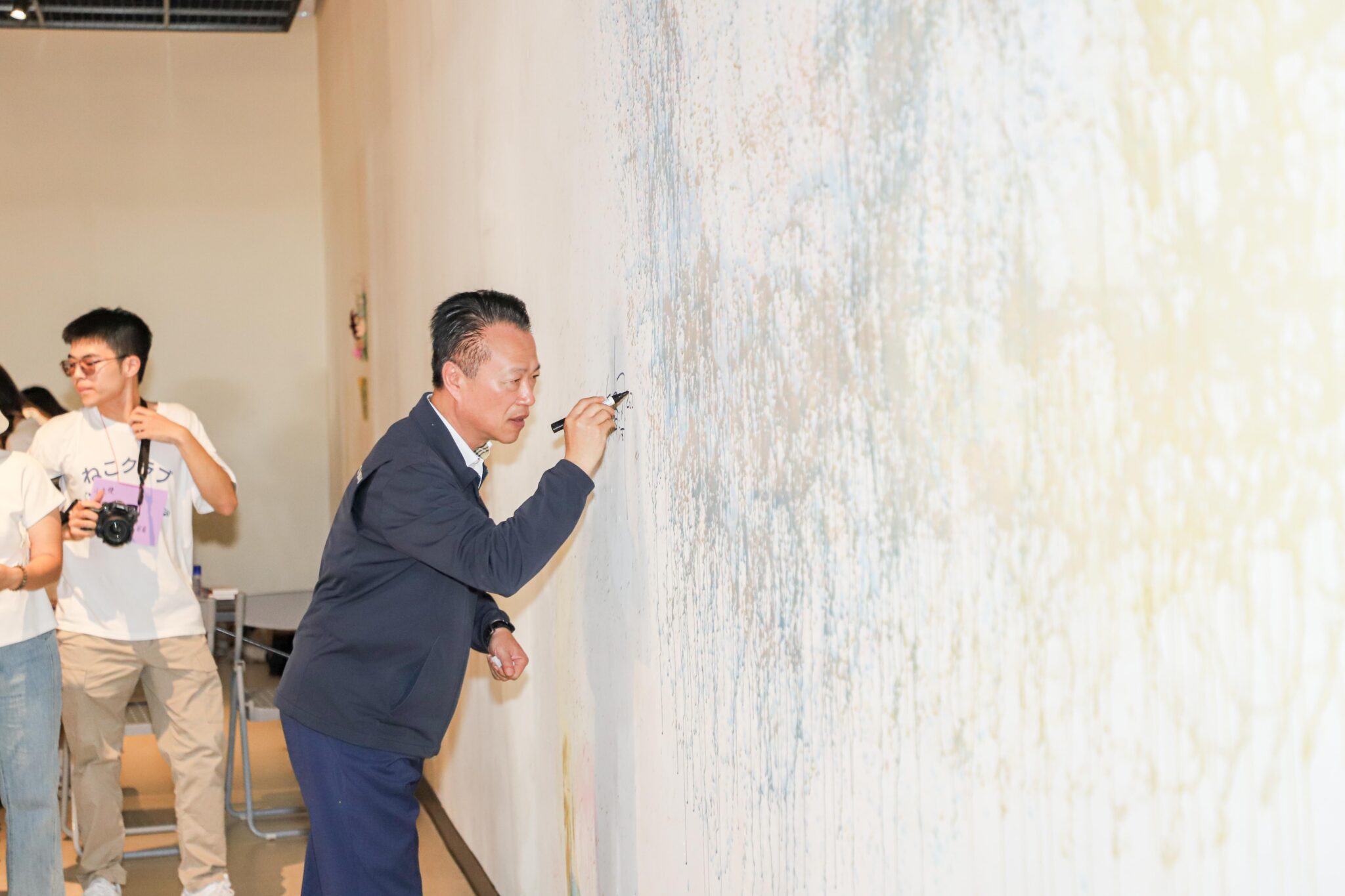 園區市集氣氛悠閒,許多民眾參與DIY活動,而梅嶺美術館即將進行裝修,館方也開放館內牆面供民眾自由創作,許多家長帶著孩子在牆上繪畫,場面溫馨;翁章梁也親自體驗,在牆上揮毫紀念。