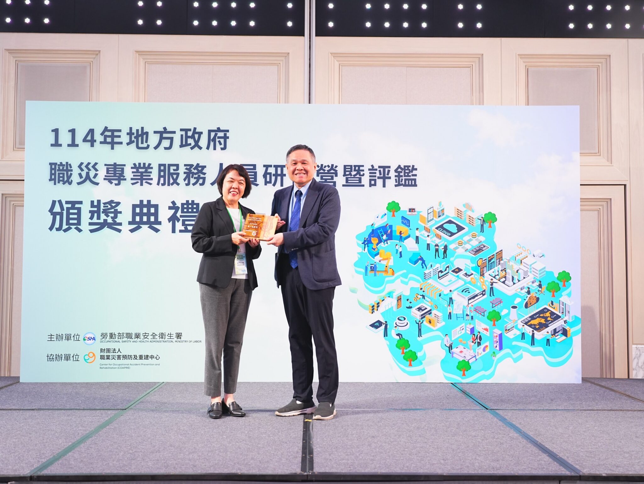 勞工局提到,勞動部日前於台中李方艾美酒店舉行頒獎典禮,由勞動部次長李健鴻親自頒獎,勞工局長林淑媛代表出席領獎,市府7名職災專業服務人員亦同時獲頒績優人員獎項。林局長表示,此次榮獲勞動部評鑑優等,不僅是對中市致力保障勞工安全與權益給予最佳肯定,也是對所有默默付出的同仁莫大的鼓勵,未來市府將持續精進服務,成為職災勞工最堅強的後盾,讓市民朋友與企業都能在安全、友善的工作環境中安心打拚。