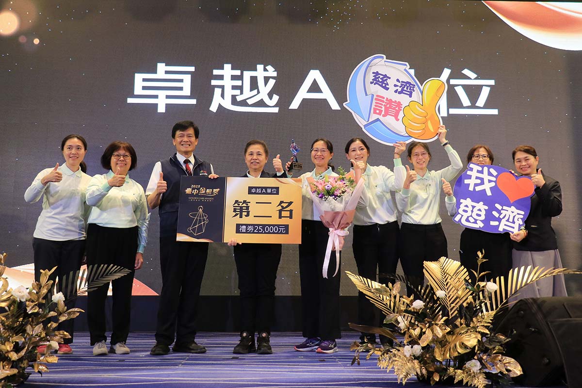 經營長照成果卓越,慈濟臺中長照團隊營運的台中慈濟護理之家與臺中市立仁愛綜合長照機構,在2025臺中金照獎花開並蒂,榮獲「卓越A單位」第二名與「卓越住宿型機構」第三名兩項團體獎。個人獎部分,臺中市立仁愛長照機構徐鐿庭奪得「長照新星獎」第二名,陳秋珍還入圍今年首度增加的「長照巨擘獎」,顯見慈濟臺中長照團隊在長照能力與品質的大幅提升。