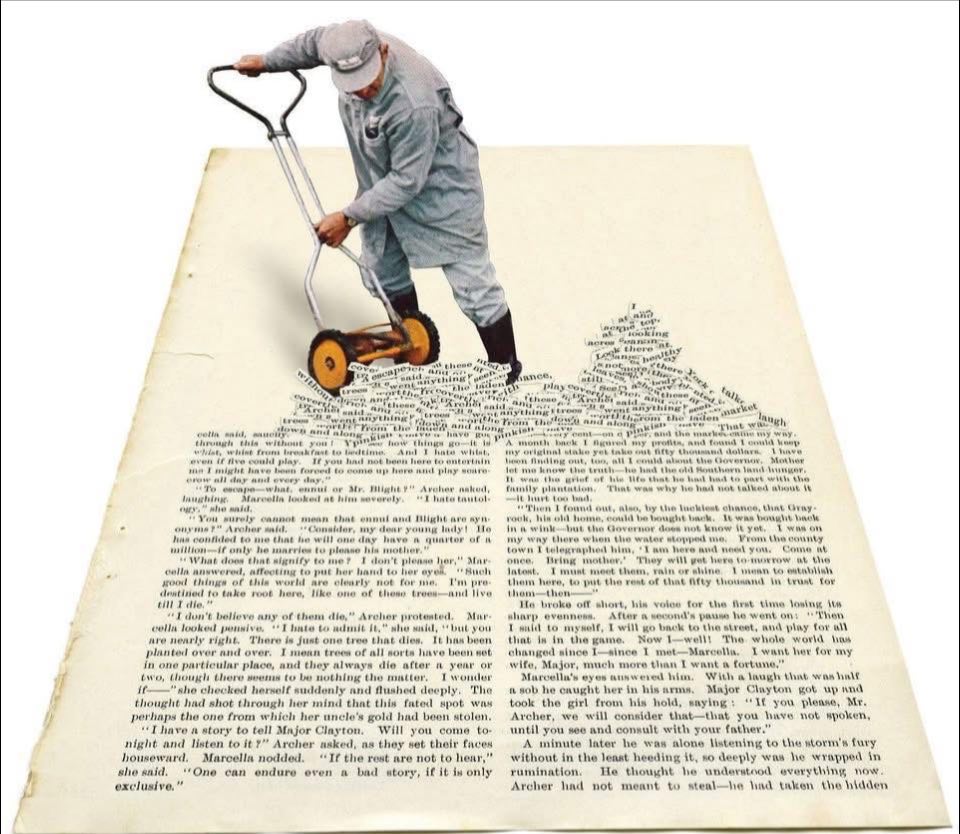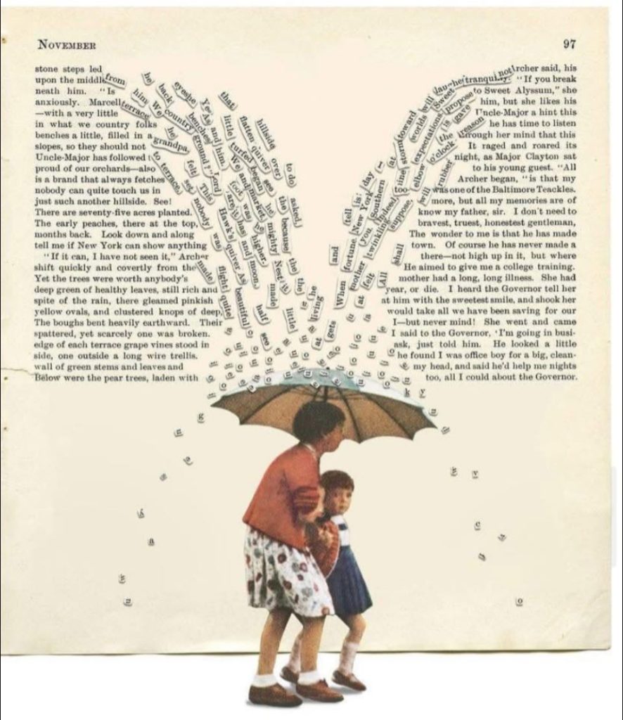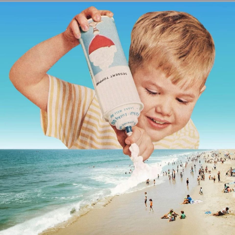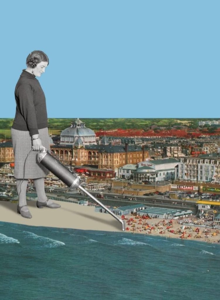 藝術家Toon Joosen 刻意將不同年代的剪紙畫面,拼貼成不相稱的場景:一片「披薩」變成談判大圓桌、女傭以吸麈器清理過剩的海岸線、小男孩把鮮奶油擠在海灘、而農夫在文字頁上「耕作」、倉促牽著孩子的媽,則躲過一場"文字雨"。