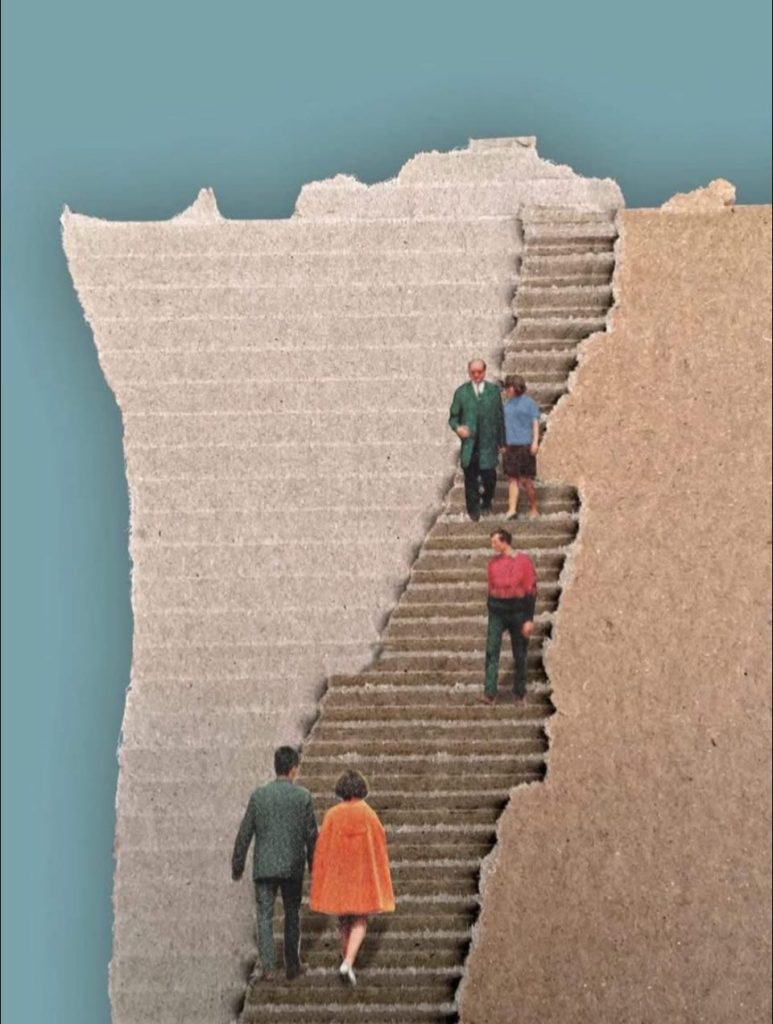 明明是同一張紙,卻各走各的階梯的一件「人走在撕裂紙頁的階梯」之作,更像是對現實的隱喻:而這種令人豁然開朗的真知灼見,恐怕也非藝術,四兩撥千斤地幽默莫屬了!