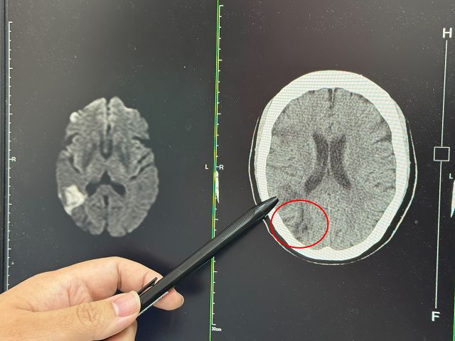 張峻誠說,聽完患者的描述,研判此症狀即是中風,先安排電腦斷層檢查,果然看到右邊中大腦動脈阻塞,為了確認阻塞範圍,進一步做核磁共振,詳細判讀後發現,婦人當時眼睛出現模糊時已經初次中風,只是比較幸運範圍較小,沒有出現手腳無力、無法行走的情形。