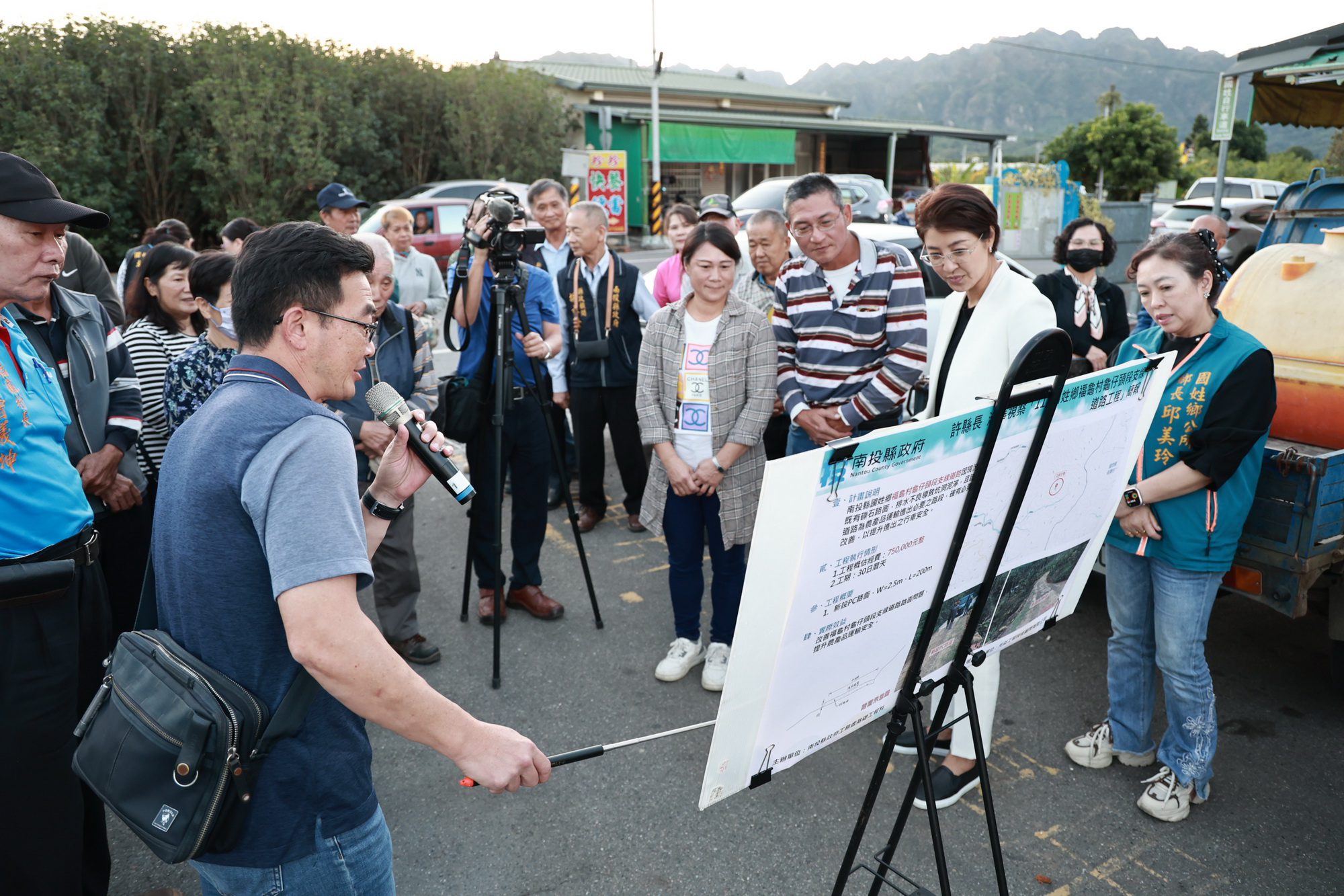 隨後,許縣長一行則是前往國姓鄉會勘9件道路改善工程,縣議員戴世詮與國姓鄉長邱美玲亦全程陪同,首先於北山派出所針對南港村龍南橋旁支線道路工程、龍南道路支線工程兩案進行簡報,並前往大石村昌榮巷13號道路工程現地會勘,陳情人與當地鄉親都到場關心,此3案皆因道路年久失修,路面破損不平,影響行車安全,許縣長指示工務處盡速發包改善,重鋪AC路面,提升道路品質與農產運輸的便利。