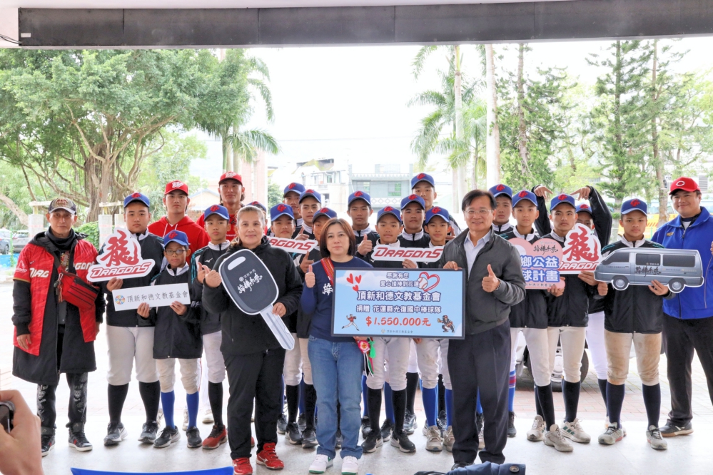 花蓮是孕育台灣職棒球員的重要搖籃,培養出無數屬於台灣的榮耀,2025 年 9 月發生的堰塞湖溢流災情,光復鄉深陷泥流危機,光復國中校園更是一片狼藉,球場及球具幾乎全毀,曾陪伴球員們追逐夢想的「接棒未來」棒球交通車也在災情中嚴重受損。頂新和德文教基金發動愛心接力,整合集團、公益夥伴與社會大眾力量,共募集155 萬元,於2026年1月邀請味全龍投手吳俊杰和外野手曾聖安一同將愛心送達光復。