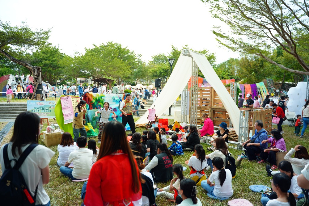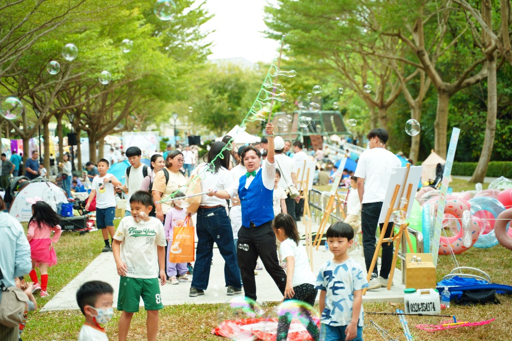 現場以七大主題串聯:「穿閱色彩流光」唯美布景成為打卡亮點;「咪彩閱讀園」邀市民聽故事、看繪本、募集交換二手書;「玩字集彩造冊趣」讓孩子親手裝幀小書;「在地特色手作體驗」以馬蹄鐵與苧麻製作平安幸運門飾,融合環保再利用概念;「可愛ㄟ馬互動」讓迷你馬成為人氣主角;「色彩躍動體驗空間」邀民眾穿上白T恤揮灑顏料,繪出屬於自己的野餐印記;「綜合馬戲表演」更以泡泡秀、小丑魔術,吸引大小孩駐足不散,成為今日的人氣主題之一。