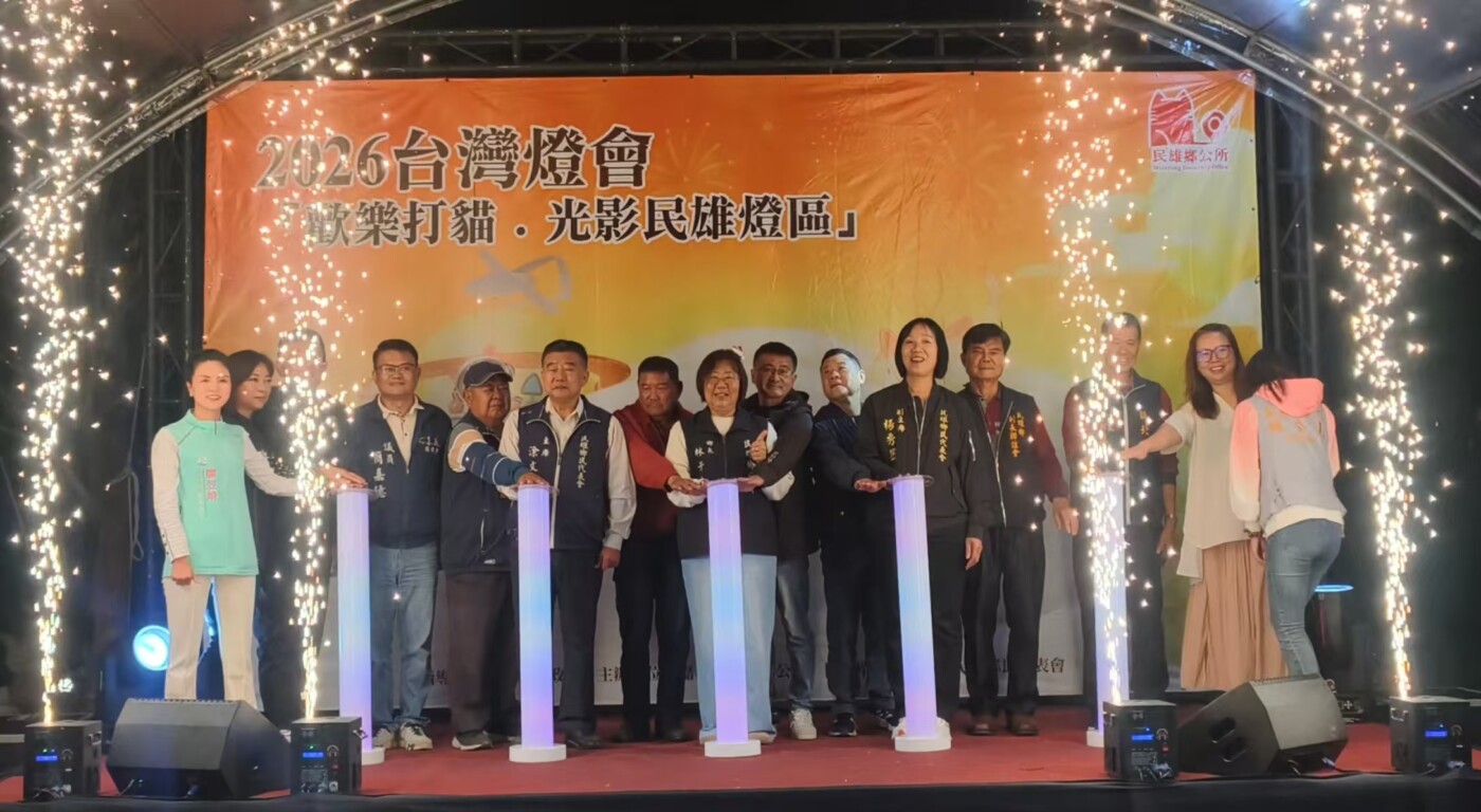 2026 台灣燈會即將在嘉義縣登場,全縣 18 鄉鎮市燈區陸續點亮。其中,民雄鄉燈區「歡樂打貓.光影民雄」於 20 日晚間舉行啟燈儀式,成為全縣首座正式亮燈的燈區,率先為「2026 台灣燈會在嘉義」揭開序幕,也吸引大批遊客搶先體驗夜間燈景。