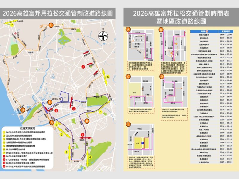 今年賽事特別規劃跑者行經北高雄各行政區之全新路線。針對交通管制路段,賽事路線使用道路不開放車輛通行,敬請用路人避開交通管制路段,提前規劃路線並配合改道。1月11日賽事相關重要管制路段及替代路線如下,請務必提前至少1小時出門,避開賽事管制時間: