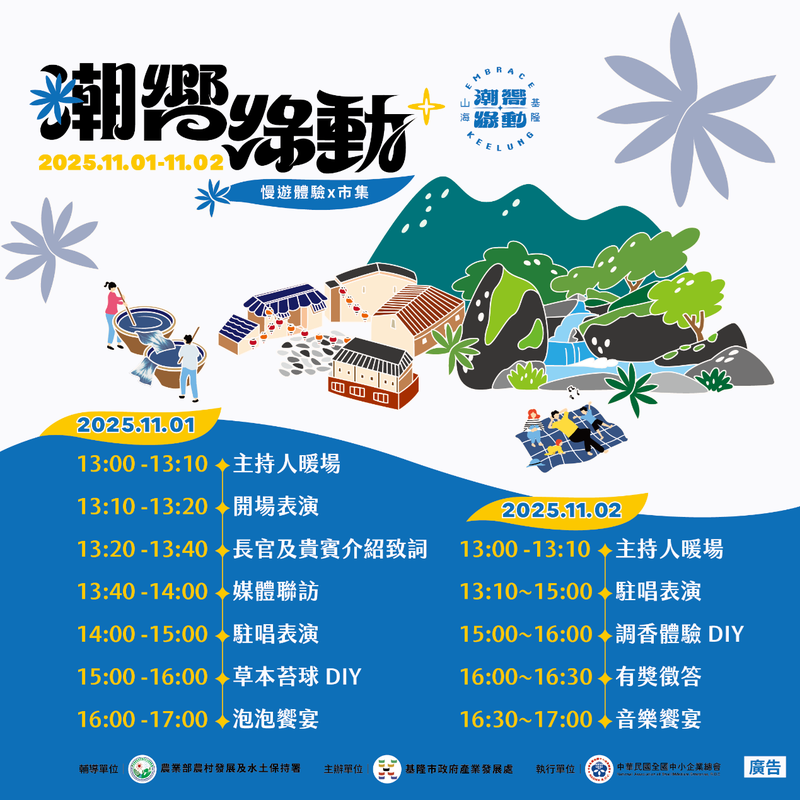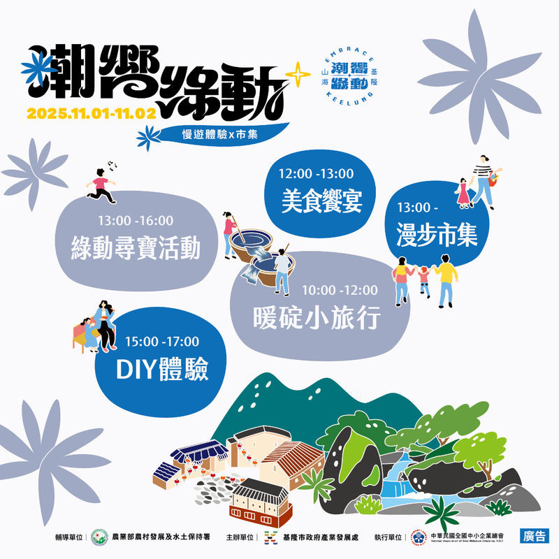 隨著秋意漸濃,基隆市政府今年度「潮嚮」系列最終場活動—「基隆潮嚮.綠動市集」,即將於 11月1日(六)至11月2日(日)13:00–17:00 在暖暖碇內十五號公園盛大登場!活動結合自然、人文與慢生活,打造一場專屬基隆的綠色盛會,邀請市民與旅客攜家帶眷,一同「森呼吸」,在山林與香氣間體驗暖碇的人文故事。