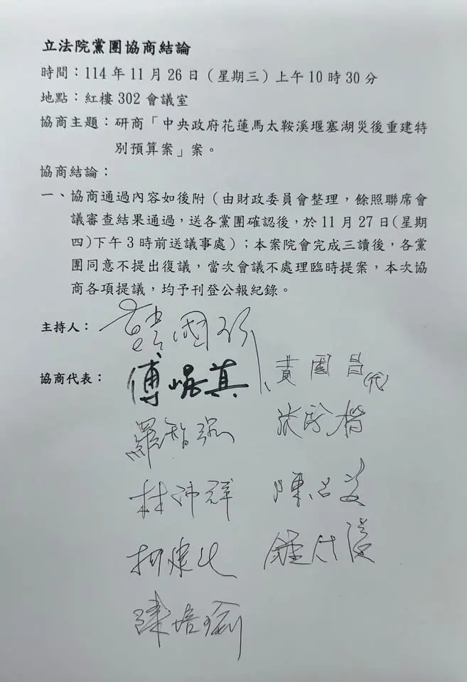 《馬太鞍溪堰塞湖災後重建特別條例》已於11月11日經總統公布施行,政府編列300億元預算,原本實際用於花蓮災民僅佔6%,在花蓮縣政府的全面檢核及崐萁的極力爭取下,今天由韓國瑜院長邀集三黨及各部會協商,要求增列的所有補助經費,全數無異議通過。